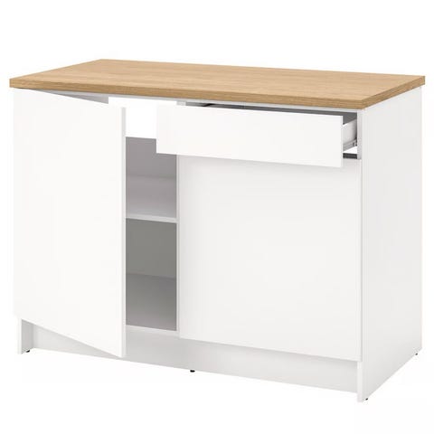 Flot skab fra ikea . Den har en lysegrå farve tror det er udgået model . Har selv sat guld greb på , og bordpladen har jeg også selv sat på. Den kom uden bordplade . Så har købt en god køkken bordplade og sat på .