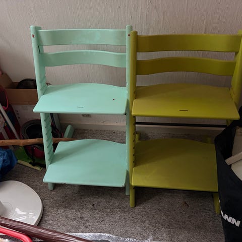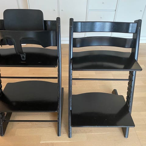2 stk. Stokke højstole til børn i sort træ. Meget velholdte, få skrammer, kun brugt hos bedsteforældre. Justerbar sidde- og fodplade for tilpasning til barnets vækst. Designet til at give støtte og komfort under måltider.