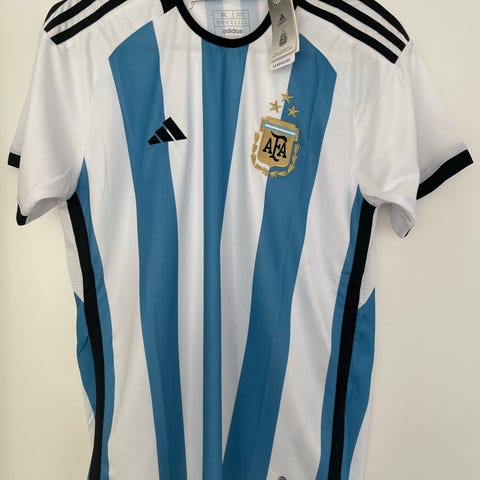 Adidas Argentina fodboldtrøje i størrelse 15-16 år / 176 cm. Trøjen har blå og hvide lodrette striber, med nummer 17 og navn 'Garnacho' på ryggen. Materialet er polyester. Trøjen har FIFA 2022 og AFA logoer på fronten.