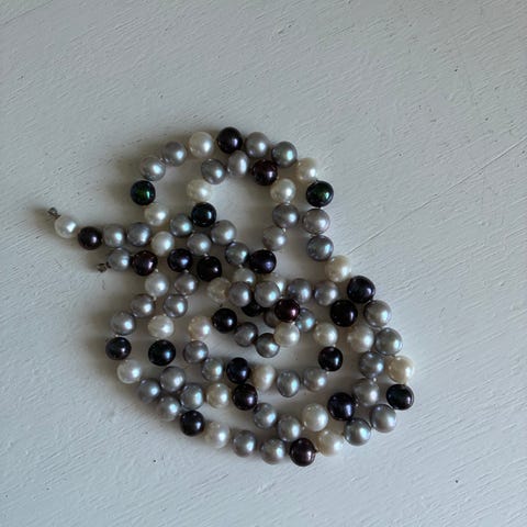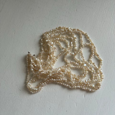 Lang perlekæde i hvid farve. Kæden består af perler med en rund form og ensartet størrelse.