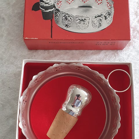 Flaskeholder, HKE, Forsølvet med holder til prop. Plus prop med forsølvet top. Meget meget flot og i æske. Aldrig brugt. Absolut god stand. Fra ikke ryger hjem. Afhentet eller plus 58 kr. til forpakning og forsendelse med tracking.