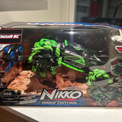Maisto Racing Offroad Racing, Rock Crawler radiostyret bil i rød farve. Bilen har store hjul med dybt mønster og en robust konstruktion designet til terrænkørsel. Inkluderer fjernbetjening og batteripakke. Egnet til udendørs brug på ujævne overflader. Brugt få gange indendørs. To genopladelige batterier medfølger og oplader. Fra røgfrit og dyrefrit hjem.