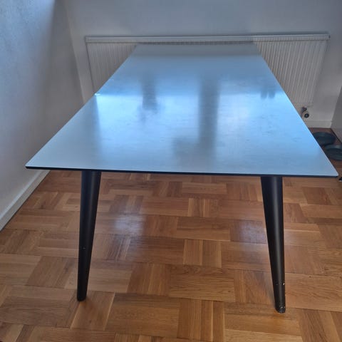 Hvidt spisebord m/stålben og 2 udtræksplader. Mål er eksklusiv udtræksplader