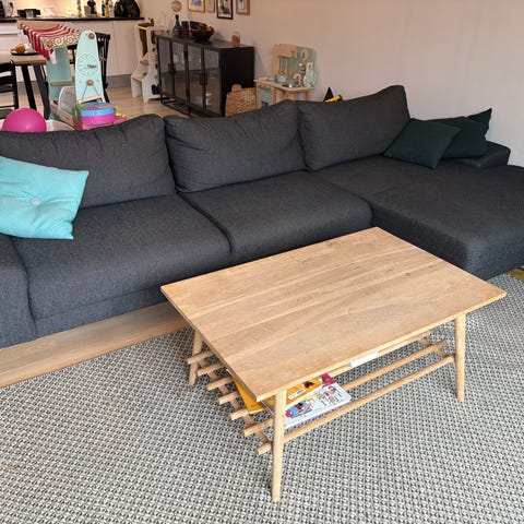Grå sofa fra ILVA med chaiselong. Sofaen er blevet lidt afbleget pga. sollys. Betrækket på puderne kan tages af og vaskes.