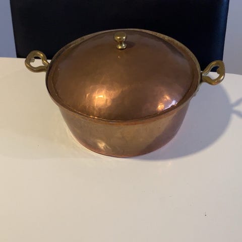 Antik kobbergryde med rund form og hank til ophæng eller transport.