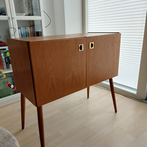 Udført med 2 skydelåger samt 3 skuffer med indsats i massivt teaktræ. Stående på fast sokkel med ben.