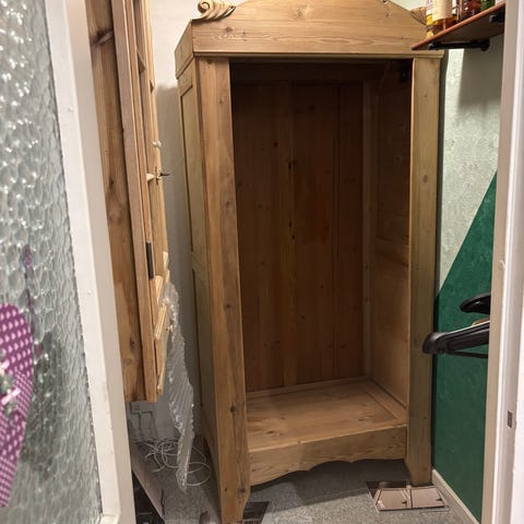 Gammelt karlekammerskab, som trænger til en kærlig hånd gives væk. Er tungt og kræver 2 personer ved flytning. Står på 1. Sal. 2 bøjlestænger. Ingen hylder.