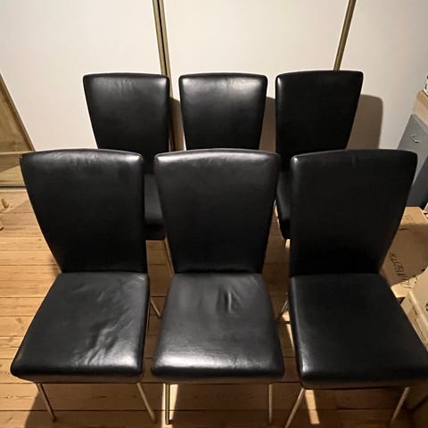 6 spisestole til salg i sort med læderhynde - alle 6 stks til 1.250 kr.