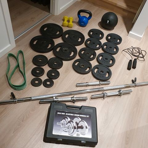 Ironmaster vægtskiver og håndvægte sæt i metal med forskellige størrelser og vægte. Sættet indeholder flere skiver, håndvægte og stænger, der kan bruges til styrketræning og vægtløftning.