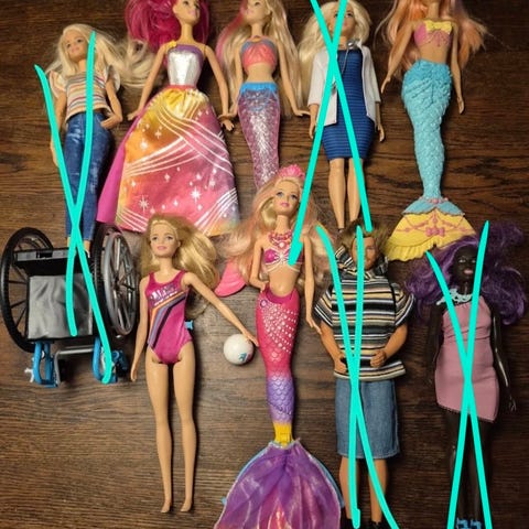 En stor kasse med Barbie dukker og tilbehør, der er også en del retro Barbie og Elsa samt andre Disney dukker