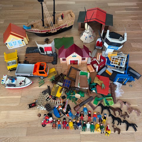 Playmobilfigurer i kasse med en masse ekstra udstyr