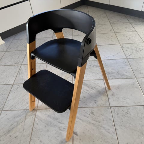 Sælger 2 stk. Stokke højstole i lys eg og hvid plast.