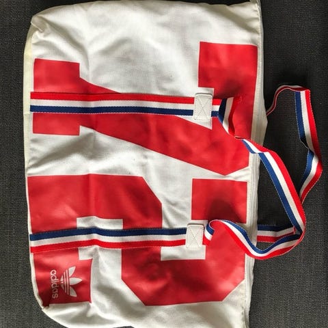 Adidas skuldertaske i plast materiale, designet til unisex brug. Tasken er blå med en hvid lynlåsdetalje og har justerbar sort skulderrem. Indvendigt findes flere rum til organisering af ejendele.