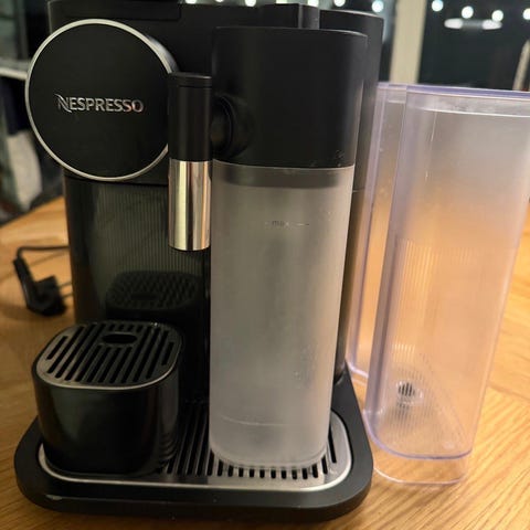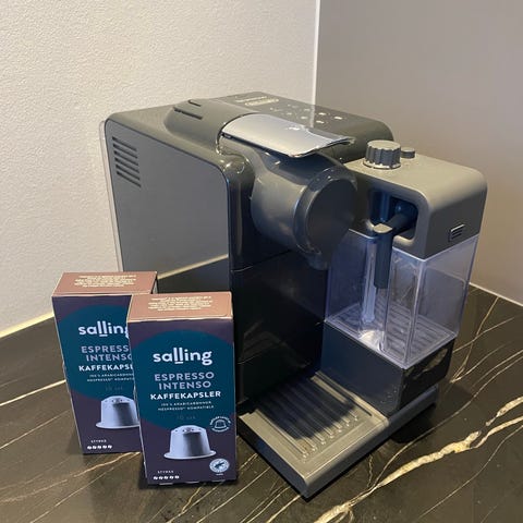 Nespresso Gran Lattissima kapsel kaffemaskine fra De'Longhi® i hvid farve. Maskinen har en integreret mælkeskummer og kontrolpanel med knapper til forskellige kaffedrikke. Den betyder, at du har seks opskrifter med kaffe og mælk lige ved hånden, fra flat white til latte macchiato. Og mulighed for tre typer sort kaffe med ristretto, espresso og lungo. Mælkekanden kan tages af og tåler opvaskemaskine, og den har et nemt skyllesystem for endnu mere bekvemmelighed Den har en aftagelig vandtank og drypbakke. Den fungerer super fint og er lige blevet afkalket. Manuel medfølger. Købspris var 2495 kr.