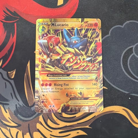 Pokémon M Gengar Pokémon kort med farverigt motiv og tekst på kortets forside og bagside. Kortet viser M Gengar med angrebsnavnet Phantom Gate og angrebsstyrke 220.