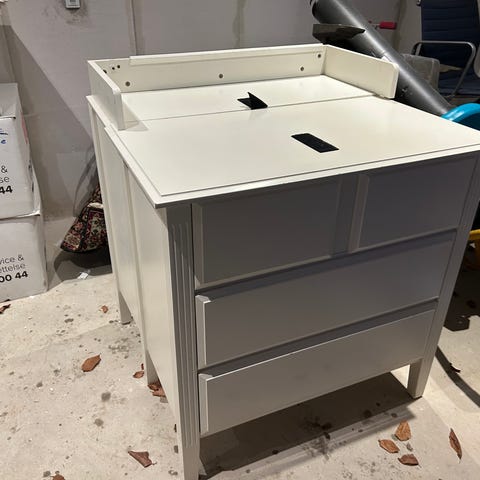 Solidt puslebord af ukendt mærke med skuffer i hvid farve. Bordet har flere skuffer til opbevaring og en hævet kant på puslepladen for sikkerhed. Pusledelen kan tages af så møblet kan bruges som alm. kommode. Designet til børneværelset med funktionelle opbevaringsmuligheder.