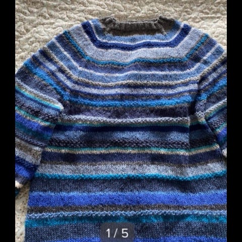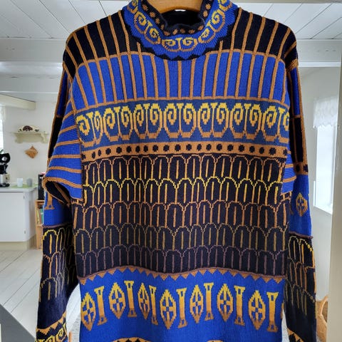 Sweater i beige farve strikket af tyndt 1-trådet Spinni uldgarn i størrelse S. Sweateren har et mønstret strikdesign og 3/4 ærmer.