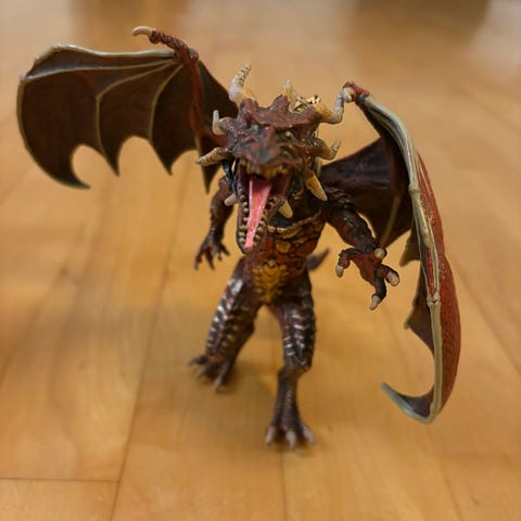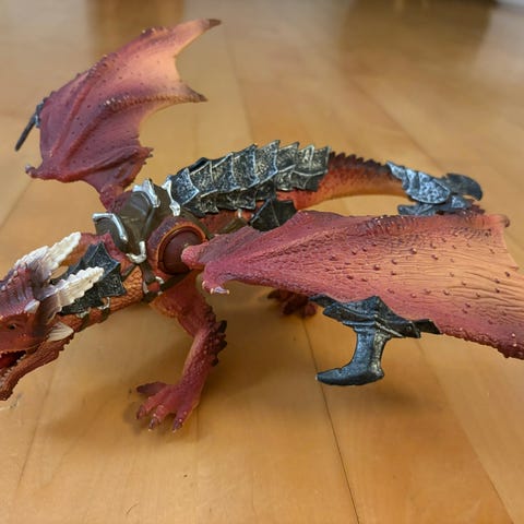 Figur af en drage i sort og lilla farve med detaljerede vinger og krop. Figuren har udstrakte vinger og en buet hale, designet med teksturer, der efterligner skæl og horn.