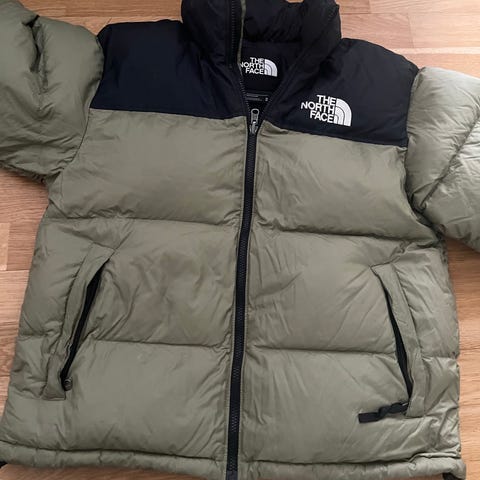 The North Face Vinterjakke i størrelse M. Jakken er grøn og er lavet af dun, hvilket giver isolering mod kulde. Designet til mænd og egnet til udendørs brug i vinterforhold.