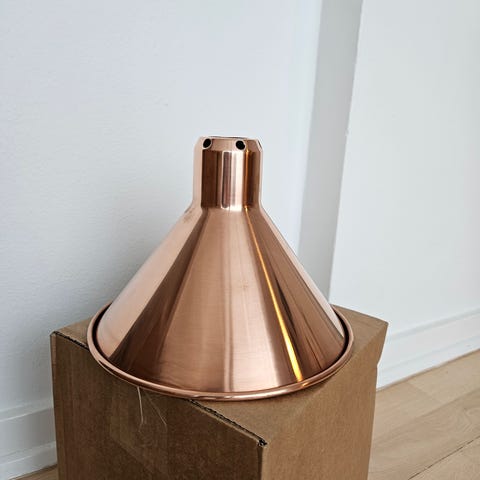 Vi har lige skiftet fra gule til sorte lampeskærme efter flytningen. Derfor sælger vi to gule "Lampe Gras" skærme. Det er det runde model, str. M, med 15.3 cm diameter nederst. Skærmen her er næsten som ny. Den andre har nogle små brugsspor. Nypris ca. 550 kr per styk.