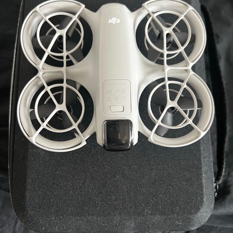 DJI neo drone med fjernbetjening. Inkluderer flere batterier, propellerbeskyttere, oplader og ekstra tilbehør. Farve: hvid. Passer til brug til luftfotografering og droneflyvning. Rigtig god begynder drone med 6 batterier og en del andet udstyr, samlet nypris ca 5000 kroner købt maj 2025 med Dji Care så rigelig garanti tilbage, kunafhentning, fast pris