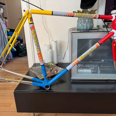 Tysk Schröder bane ramme i Reynolds rør. Har ikke meget info om den desværre. Campagnolo boks. Usikker på headset - kan det være OMAS? Overrør måler 53,5cm m/m. Sadelrør 51cm m/m.