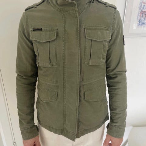 Robust Superdry's 'Limited Edition sort army jacket “black washed” str XL velegnet til en sweater under.