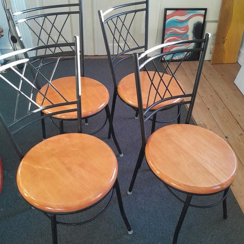 6 stk. café stole i chrom med plastsæde. Gode at sidde på. Fylder ikke meget ved et bord. Skal helst hentes.