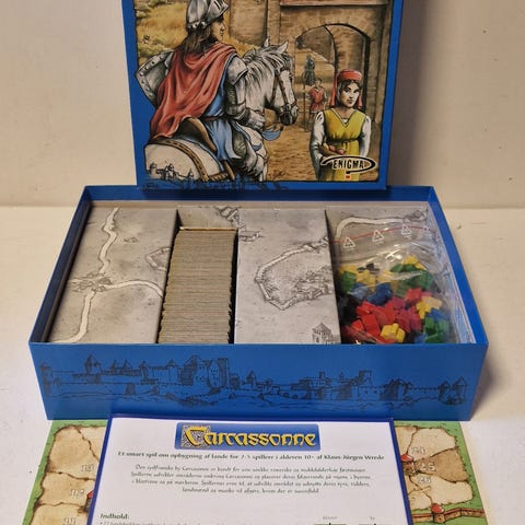 Carcassonne Brætspil 2001 udgave. Inkluderer spilbrikker og regelbog. Kan spilles af flere deltagere og egnet til familiespil og strategispil.