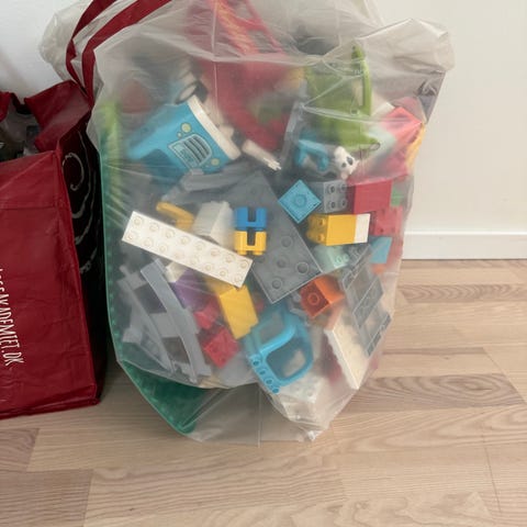 Ikea sæk og kasse fyldt med LEGO DUPLO