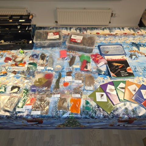 Diverse fluebindingsmaterialer og værktøj til fiskeri