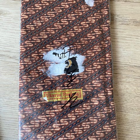 Prampranan Ultrafine Cotton Batik stof i brun med mønster. Materialet er bomuld, velegnet til beklædning eller tekstilprojekter. Sarongen/stoffet er håndmalet med voks som man oprindeligt gjorde det på Bali så mønstret er altså ikke trykt på som moderne sarongs. Det er meget smukt og helt unikt med enkelte små variationer/den helt rette patina. Jeg har to stk.