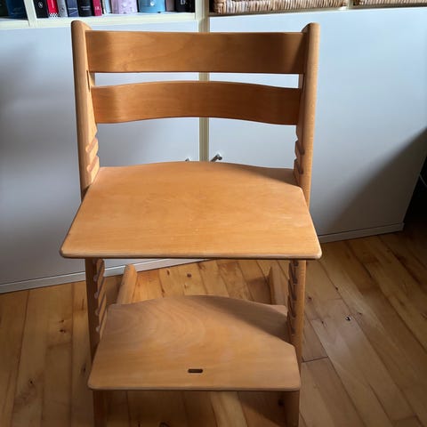 Stokke højstol i træ, designet til børn. Højstolen har justerbar sidde- og fodstøtte for tilpasning til barnets vækst. Leveres med farverigt polstret sædehynde for ekstra komfort.