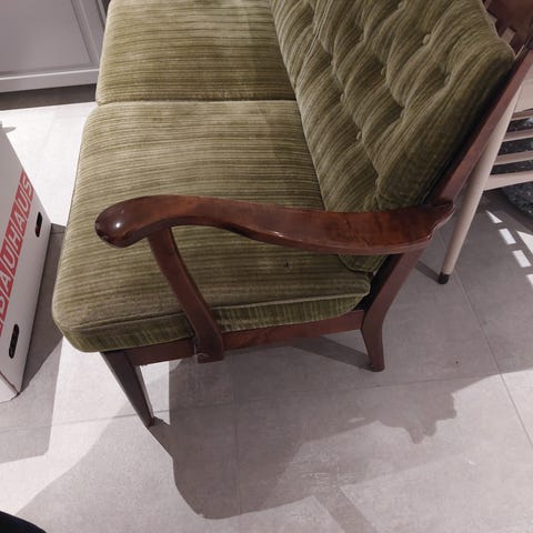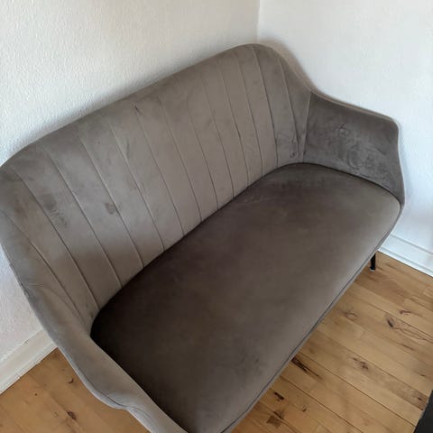 Fin lille sofa. Har en del brugsspor og trænger til en grundig rengøring efter at have stået hhv. på loftet og i garagen i flere år (se fotos).