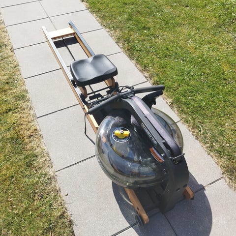 Apollo AR romaskine med vandmodstand og træramme. Udstyret med justerbart sæde og håndtag, designet til at simulere en realistisk rooplevelse. Vandmodstanden kan justeres for at variere intensiteten af træningen.