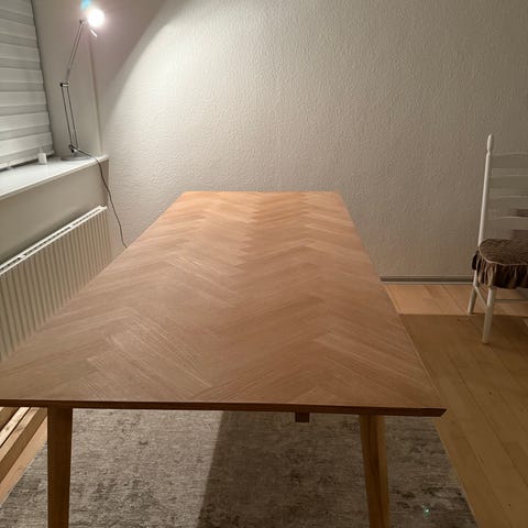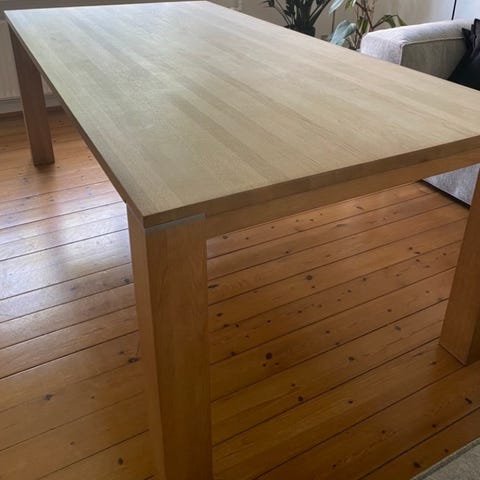 Langt ellipseformet spisebord i valnød/olie. Bordet er fra møbelfirmaet Axelsen. Det sidder behageligt 8-10 personer. Bordet er i god stand, med tegn på brug. Bordpladen er 3 cm tyk og kan nemt slibes ned og så er bordet som nyt igen. Der er 4 firkantede stålben med valnød 9,5x9,5