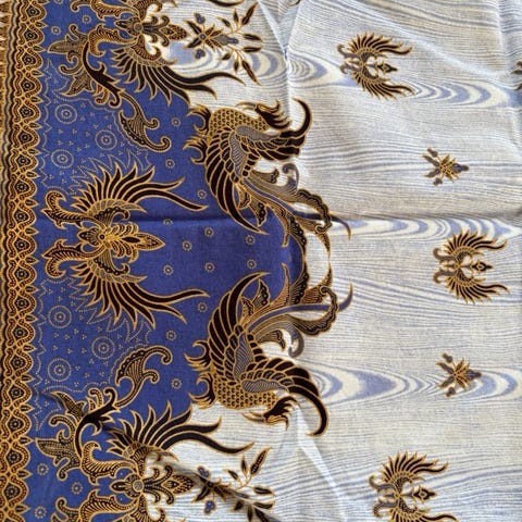 Prampranan Ultrafine Cotton Batik stof i brun med mønster. Materialet er bomuld, velegnet til beklædning eller tekstilprojekter. Sarongen/stoffet er håndmalet med voks som man oprindeligt gjorde det på Bali så mønstret er altså ikke trykt på som moderne sarongs. Det er meget smukt og helt unikt med enkelte små variationer/den helt rette patina. Jeg har to stk.
