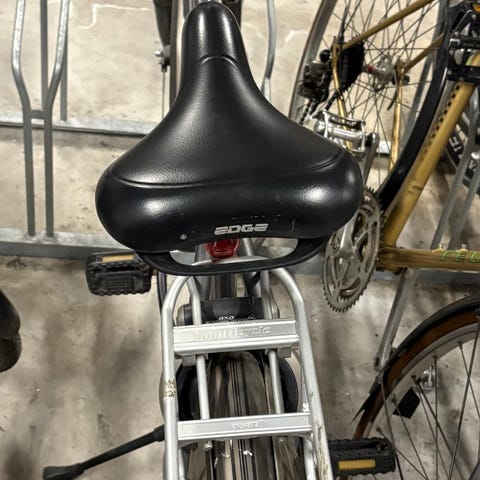 Den har en monteret lås og dynamolygte foran og baglygte med batteri bagpå.