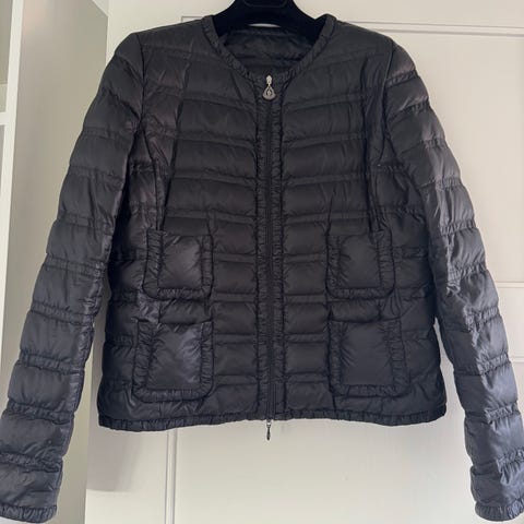 Flot og varm lang jakke fra Moncler med aftagelig hætte. Alle lynlåse virker. Tovejs lukning. Har lidt slid nederst ved lynlåsen - se foto). Desværre er den ene dims (skyderen) til lynlåsen faldet af - se foto. Men du kan sagtens lukke jakke. Jakken er en str 1, min datter bruger str S. Jakken er ægte.