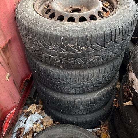 Dæk med fælge, brugt, vist i billeder med sne. Specifikke mærker, størrelser og materialer er ikke angivet. Brugt til en Chevrolet Cruze - bud modtages