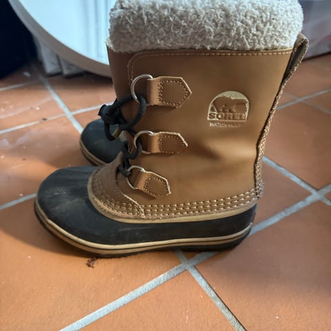 Sorel børnestøvler i unisex design, størrelse 33. Støvlerne har en kombination af materialer, herunder vandafvisende yderside og foret indvendigt for ekstra varme og komfort. Velegnede til udendørs brug i koldere vejrforhold.
