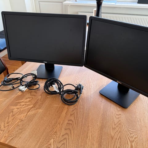 Dell 24" skærm med standard tilslutninger. Skærmen har en størrelse på 24 tommer og leveres med nødvendige kabler til tilslutning.