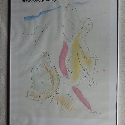 Forsiden bærer kunstmotiv og trykt signatur, bagsiden er mærket Galerie Asbæk.