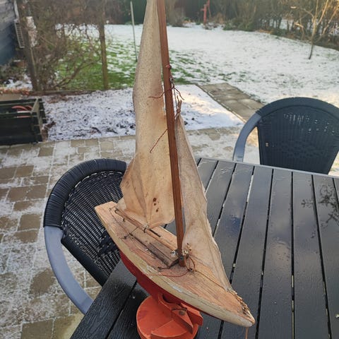 Legetøjspiratskib med sejl, reb og detaljer som kanoner og et rat. Skibet har et trælook med sort og guld farve samt et hvidt sejl med piratmotiv. Velegnet til leg og samling.