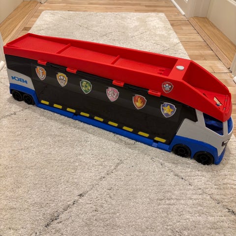 Paw Patrol legetøjslastbil med rampe, der kan åbnes for adgang til opbevaringsplads indeni. Lastbilen er fremstillet i plastik og har en kombination af rød, sort og blå farve.