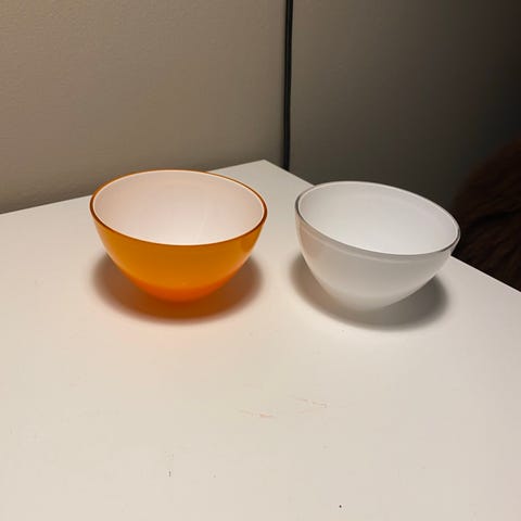 Holmegaard Cocoon skål, designet af Peter Svarrer. Materiale: Den er lavet af mundblæst opalglas, hvor ydersiden har en lys, gylden nuance, og indersiden er hvid. 25 x 15 cm