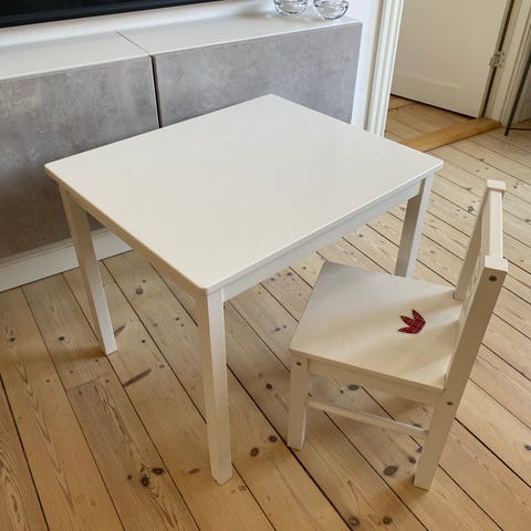 IKEA børnebord og stol sæt med bordplade i hvid og stel i træ. Designet til børn med passende størrelse til børneværelset eller legeområdet. Sættet består af et bord og en stol, der kan bruges til forskellige aktiviteter som leg, tegning eller spisning.