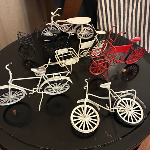 Sæt af miniature cykler lavet i metal i forskellige farver, herunder sort, hvid, rød, gul og grøn. Modellerne inkluderer forskellige typer cykler som tandemcykel, ladcykel, og klassiske cykler. Nogle af cyklerne har ekstra detaljer som kurve eller lad. Egnet til dekoration eller samling.