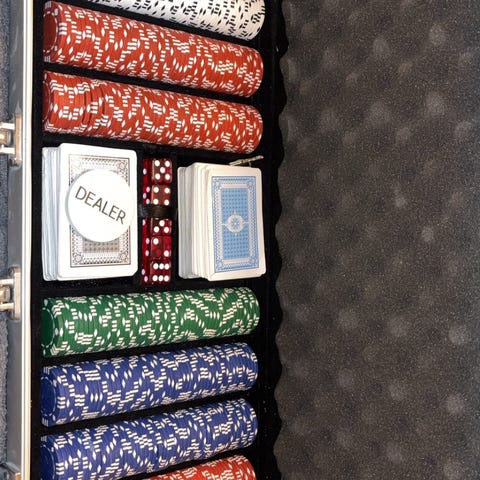 "Pro Chips" pokersæt med jetoner, kort og 5 terninger. Gammelt, med yderst sjældent brugt.