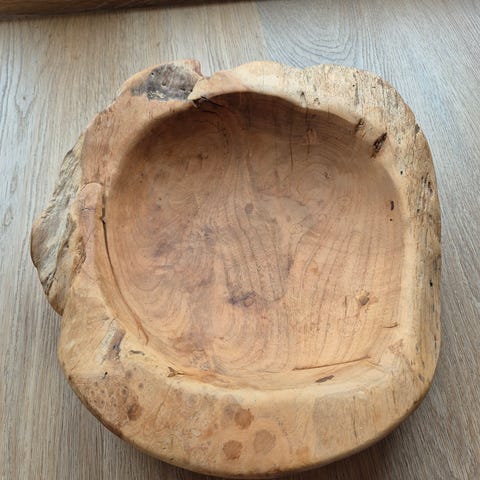 Stort træ fad med glas klokke fra POSKA str. Ø 56,5 cm.